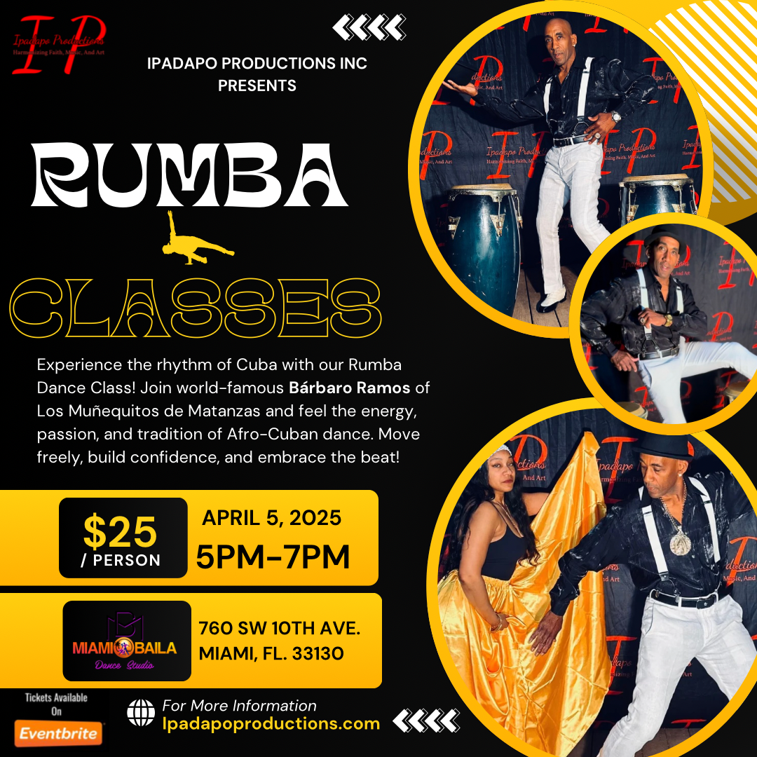 Join us for an electrifying Rumba dance class at Miami Baila Studio on April 5th from 5-7 PM! Learn from world-famous Bárbaro Ramos of Los Muñequitos de Matanzas and experience the passion, rhythm, and tradition of Afro-Cuban dance. Don’t miss this unique opportunity to train with a true master!